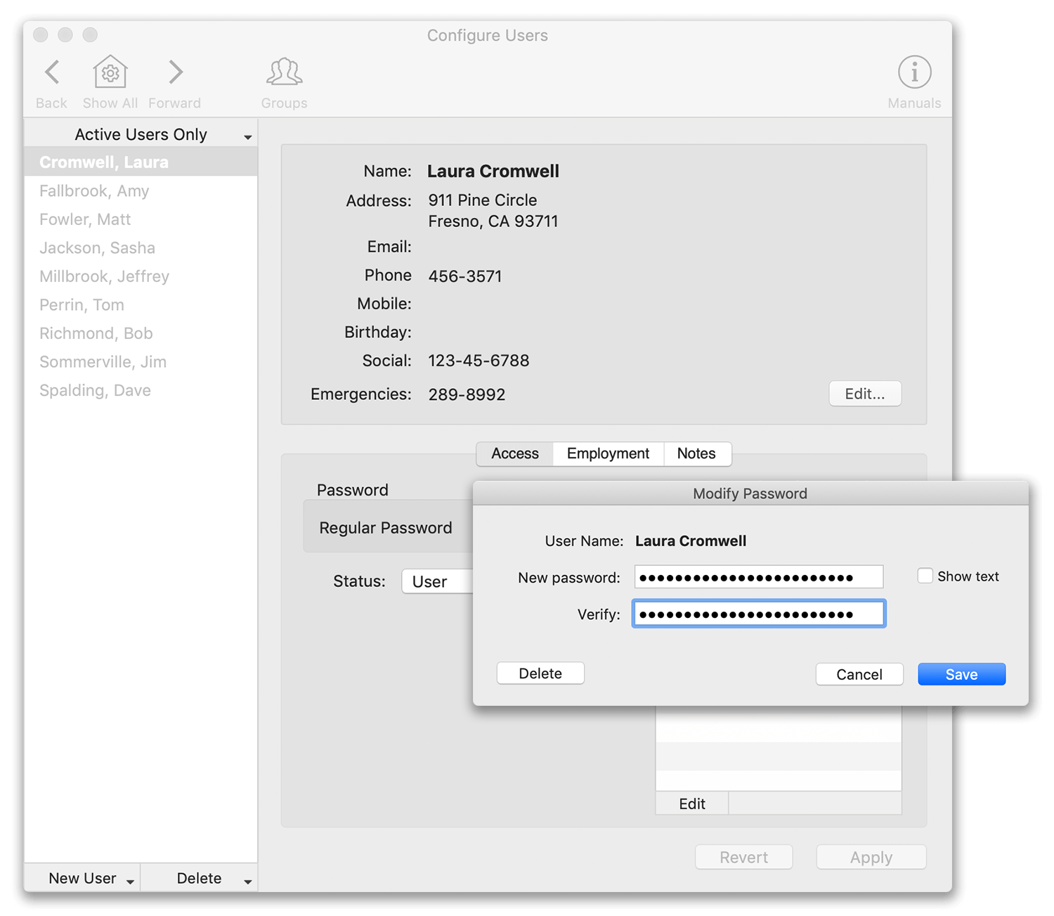 Under the Configure menu, choose Users and select an employee's name. In the password field, choose the Create (or Modify) button and scan the RFID tag or barcode you created for that particular user into the New Password and Verify fields. This will ensure that the user's password matches the badge code exactly.